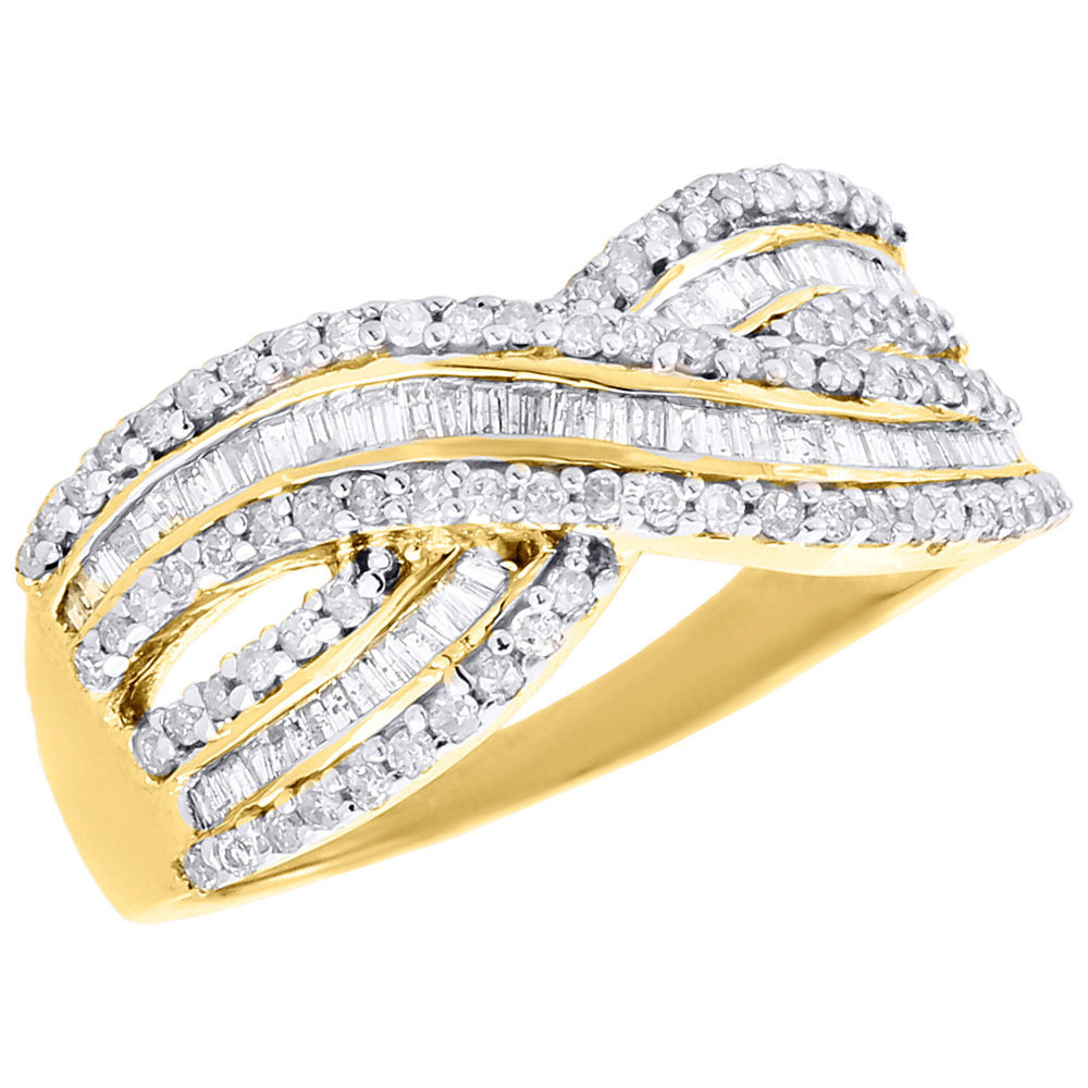 - 10K Yellow Gold Baguette & Round Diamond Crossover Band Right Hand Ring 1/2 Ct