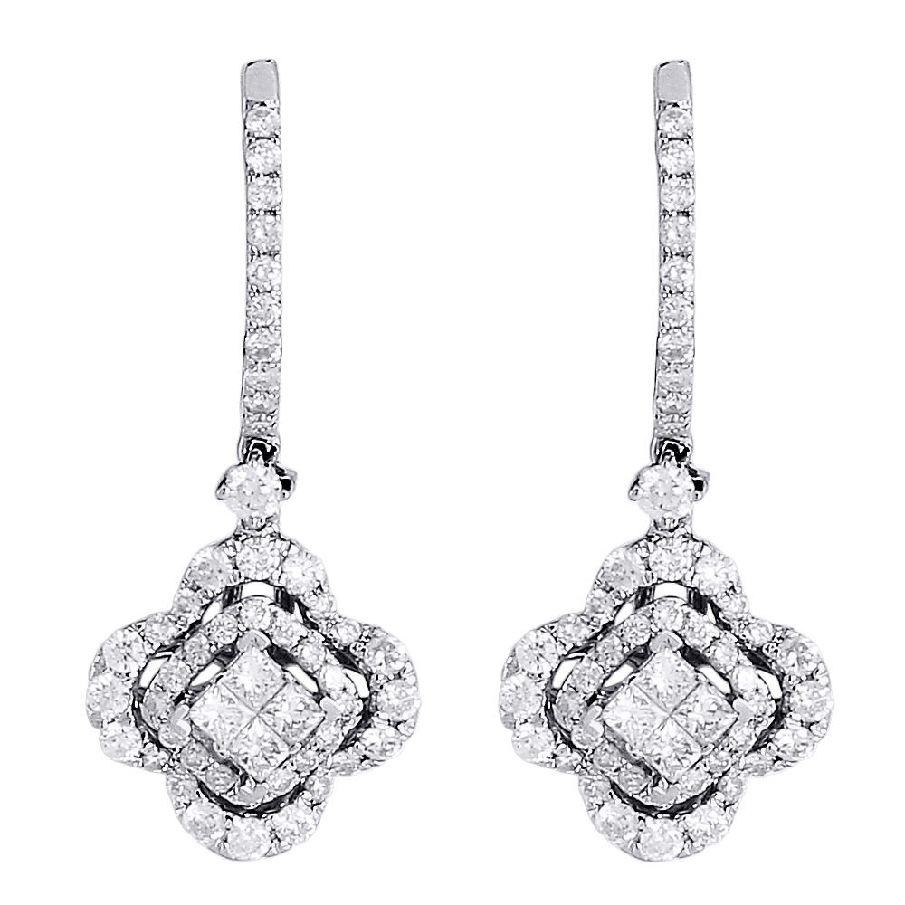 - Diamond Flower Earrings Ladies 14K White Gold Princess Cut Danglers 0.95 Tcw.
