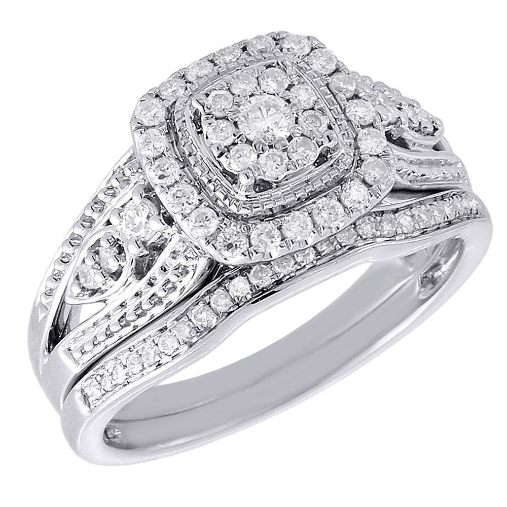 Up for sale is a very affordable priced genuine diamond bridal set. This bridal is set in real 10K White Gold and real round cut diamonds in prong setting. Diamonds are set close together around the halo design for a uniform and clean look. The diamonds are machine set precisely to give it a clean finish. This engagement ring has a matching engagement band that wraps around the engagement ring perfectly. Center is a flower setting complimented by round cut diamonds on the engagement ring and the band that compliments the engagement ring.