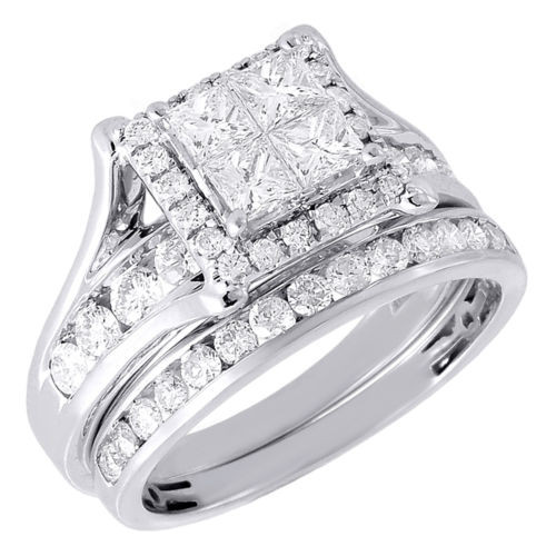 Up for sale is a very affordable priced genuine diamond bridal set. This bridal is set in real 14K White Gold and real princess and round cut diamonds in prong setting. Diamonds are set close together around the halo design for a uniform and clean look. The diamonds are machine set precisely to give it a clean finish. This engagement ring has a matching engagement band that wraps around the engagement ring perfectly. Center princess cut quad set is complimented by round cut diamonds on the engagement ring and the band that compliments the engagement ring.