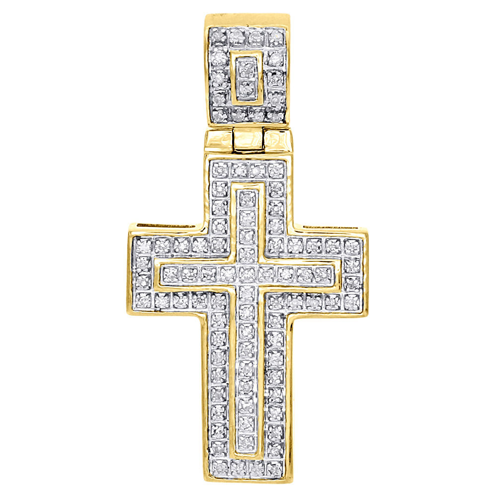 (5.1 grams of 10K Yellow Gold | 0.25 total carats of white diamonds | 1.45" long & 0.75" wide | SI2 - I1 Clarity & H - I Color | Mens Diamond Flat Mini Cross Pendant Pave Setting Charm)