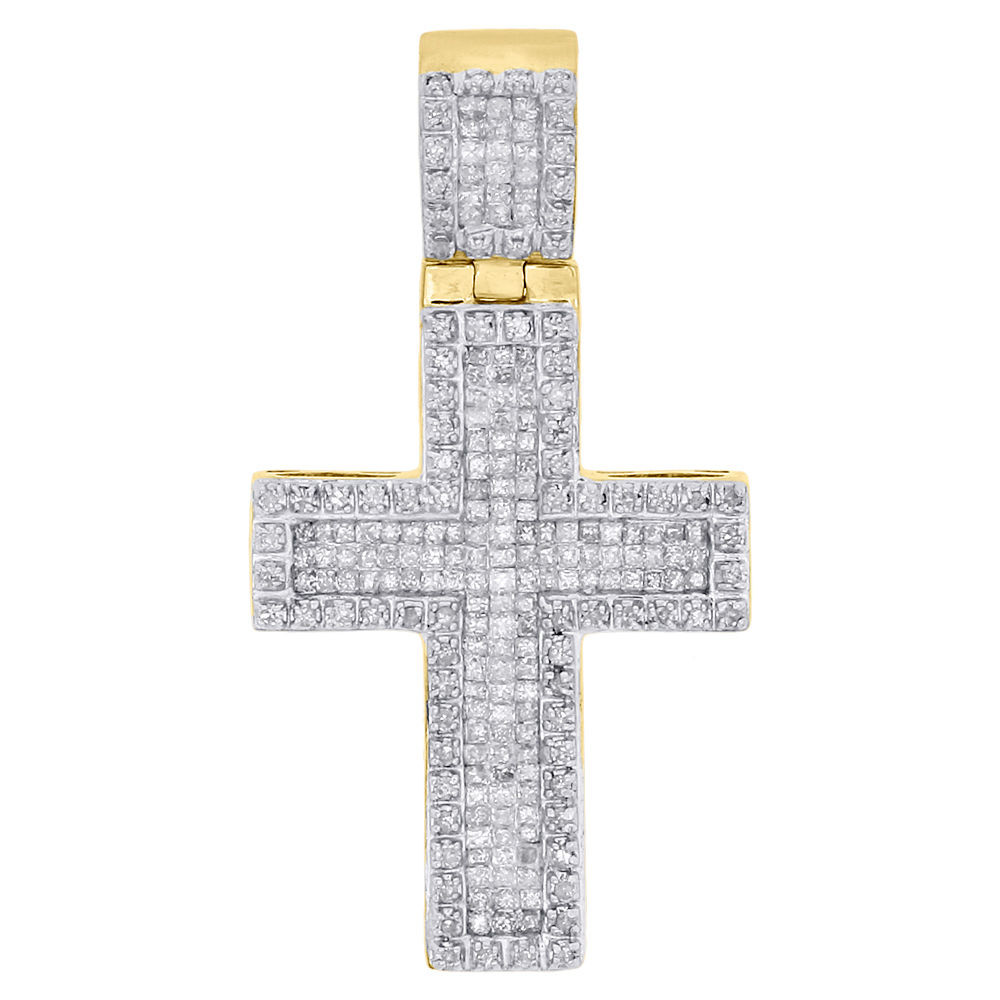 (5 grams of 10K Yellow Gold | 1 total carats of white diamonds | 1.45" long & 0.75" wide | SI2 - I1 Clarity & H - I Color | Mens Princess & Round Cut Mini Flat Diamond Cross Pendant / Charm )