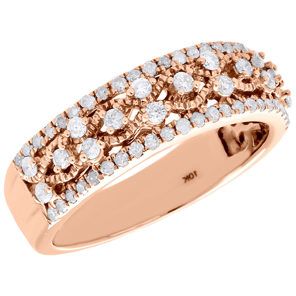 - 10K Rose Gold Diamond Filigree Waved Ladies Anniversary Ring Wedding Band 1/2 Ct