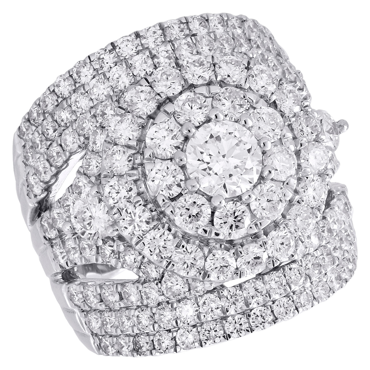This exquisite diamond engagement ring, fashioned in 14K white gold. This ring showcases a solitaire round cut diamond center stone that grabs the eye. A double round shaped halo frame of smaller accent round diamonds surrounds the center solitaire, while additional round diamonds adorn the split shank frame. Radiant with 5 ct. total weight of diamonds and a bright high polished shine, this engagement ring will sparkle for a lifetime, a look she'll always treasure. Diamonds are held by shared prong setting between the gold mounting. The diamonds are machine set precisely to give it a smooth uniform flow. Solid mounting, the ring weighs approx. 17.1 grams of gold. All diamonds in this ring are matching in clarity & color.