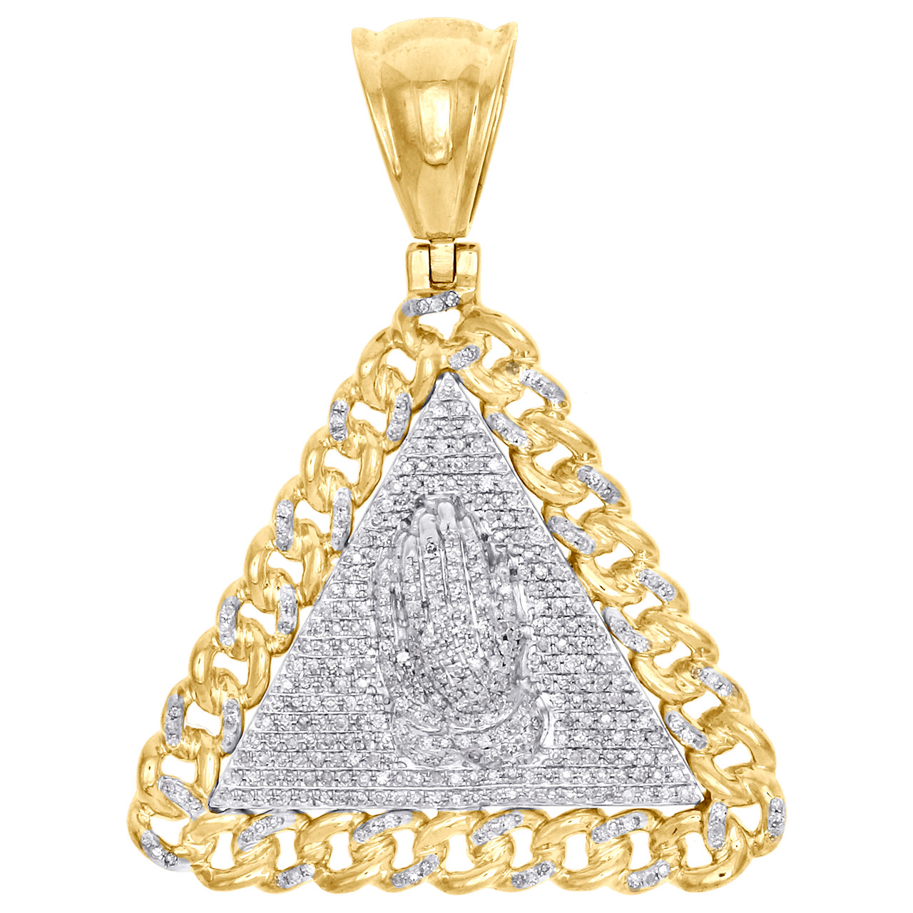 This eye-catching Statement Praying Hands Cuban Link Triangle Frame diamond pendant is crafted in solid 10K Yellow Gold and shimmering white diamonds, ensuring sparkle from every angle. Radiant with 1 ct. t.w. of genuine diamonds, this pendant is polished to a bright shine. Exclusive style has a well built frame to withstand everyday wear and tear. The diamonds are securely held between the gold mounting in a pave setting close together, making the overall appearance larger and lustrous. High-polished plain bail to match. These are all 100% genuine round diamonds. All the diamonds are of same clarity and color throughout. Great size pendant is 2 inches in length and weighs approx. 10.8 grams. This one of a kind piece would make a perfect addition to your jewelry collection.