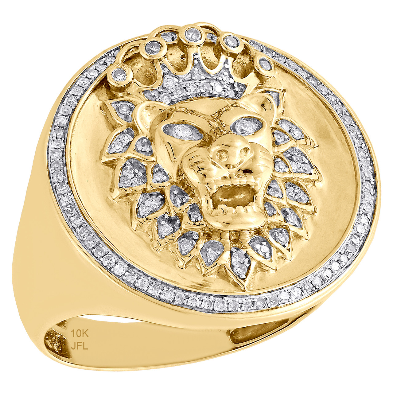 A bold and manly look, this sparkling diamond Lion Face statement ring is just the perfect style for him. Brilliantly crafted in genuine 10K yellow gold, this ring features cluster of sparkling diamonds set in 24mm circle frame. This ring design was intricately thought out so it can worn for any occasion, no matter how casual or fancy. Row of diamonds borders the circle frame with 3D lion head in the center. This pinky ring makes a bold fashion statement. Make an impression with this exclusive ring captivating 3/8 ct. t.w of genuine round white diamonds, and high-polished to a lustrous shine. This ring is caged back and weighs approx 9.9 grams. All diamonds are 100% natural and are of matching clarity and color throughout. The diamonds are securely held in pave / prong setting, making the overall appearance larger and lustrous. Available in size 10, can be sized upon request for additional charge.