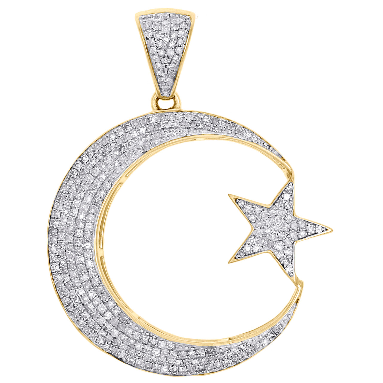 (3.4 gr. of 10K Yellow Gold | Total Carat Weight: 0.75 ct. t.w. of white diamonds | Length: 1.55" (including bail) | Width: 1.20" | Clarity: I1 - I2 | Color: H - I | Men's Genuine Diamond Crescent Moon and Star Islamic Pendant Pave Charm)