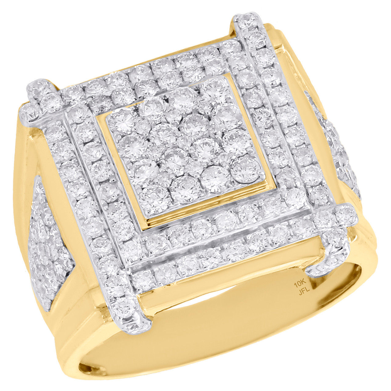 A bold and manly look, this sparkling diamond ring is just the perfect style for him. Brilliantly crafted in solid 10K yellow gold, this ring features cluster of sparkling diamonds set in 21mm frame. This ring design was intricately thought out so it can worn for any occasion, no matter how casual or fancy. Row after row of diamonds, with three step square cluster frame. This fancy statement ring makes a bold fashion statement. Make an impression with this exclusive ring captivating 3 ct. t.w of genuine brilliant full cut round white diamonds, and polished to a brilliant shine. This ring is caged back and weighs approx 8.7 grams. All diamonds are 100% natural and are of matching clarity and color throughout. The diamonds are securely held in pave setting, making the overall appearance larger and lustrous. Available in size 10, can be sized upon request for additional charge.