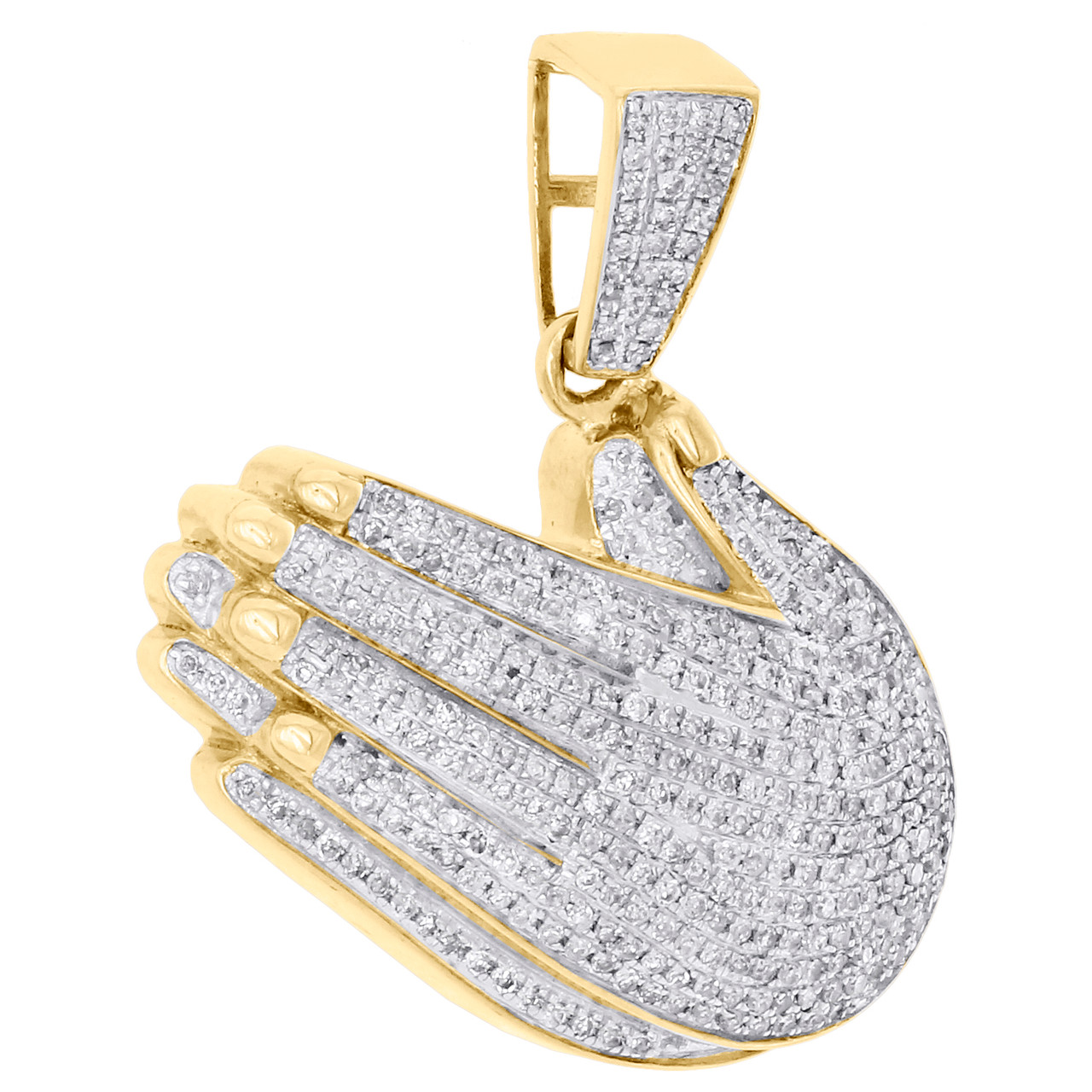 This eye-catching Praying Hands diamond pendant is crafted in solid 10K yellow gold & shimmering white diamonds, ensuring sparkle from every angle. Radiant with 7/8 ct. t.w. of genuine diamonds, this pendant is high polished to a bright shine. Exclusive style has a well built frame with caged back to withstand everyday wear and tear. The diamonds are securely held between the gold mounting in a pave setting close together, making the overall appearance larger and lustrous. Diamond bail to match and give this exclusive pendant a high end custom look. These are all 100% genuine round diamonds. All the diamonds are of same clarity and color throughout. This great size men's pendant is 1.30 inches in length and weighs approx. 6.7 grams. This one of a kind piece would make a perfect addition to your jewelry collection.