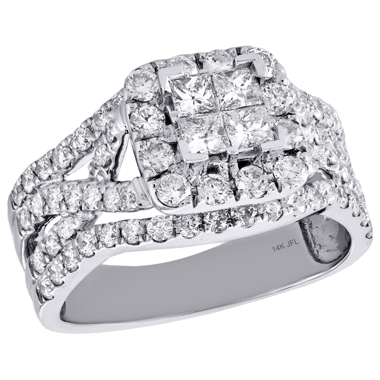 14K White Gold Quad Princess Diamond Intersecting Halo Engagement Ring 2 Ct.