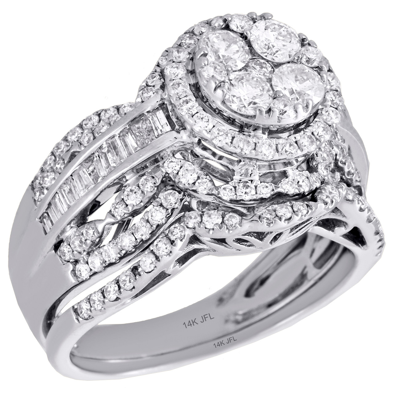 14K White Gold Diamond Bridal Set Halo Engagement Ring + Wedding Band 1.5 Ct.
