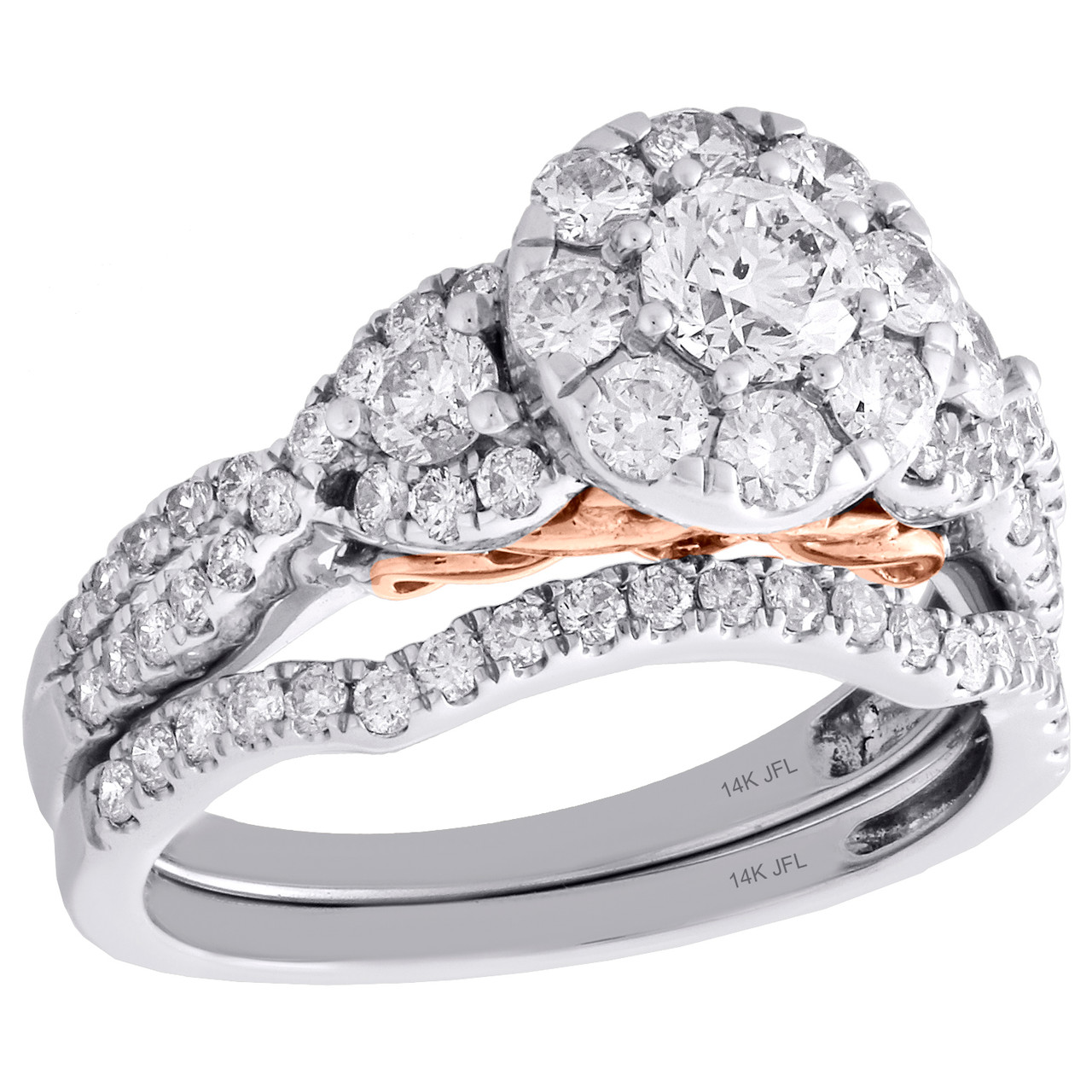 (5.8 gr. of 14K White & Rose Gold | Total Carat Weight: 1.50 ct. ( 3/8 ct. CRD) of white diamonds | Center Width: 9mm | Band Width (shank): 7.25mm | Head Rise: 8.75mm | Clarity: SI2 - I1 | | Color: H - I | Women's Bellissimo Collection diamond bridal wedding set with matching engagement band)