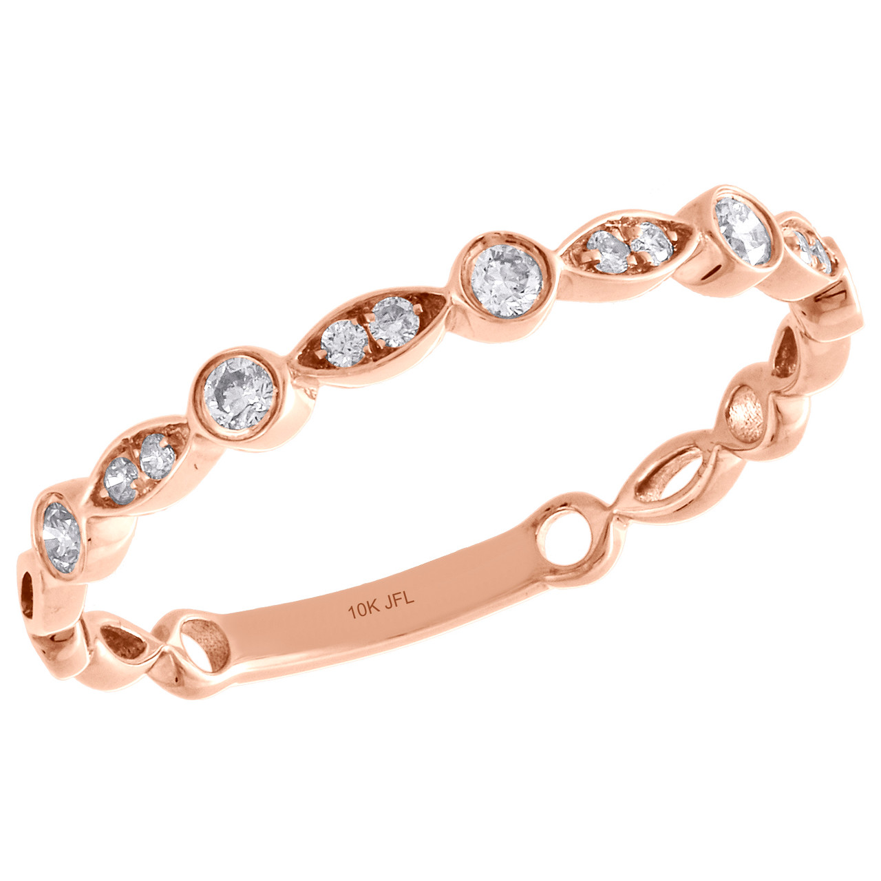 This exquisite diamond stackable ring, fashioned in 10K rose gold. The eye is drawn to the alternating teardrop and circular design with round diamonds. Radiant with 0.17 ct. total weight of diamonds and a bright high polished shine, this fashion ring will sparkle for a lifetime, a look she'll always treasure. Diamonds are held by bezel and shared prongs between the gold mounting. The diamonds are machine set precisely to give it a smooth uniform flow. Solid mounting, the ring weighs approx. 0.9 grams of gold. All diamonds in this ring are matching in clarity & color.