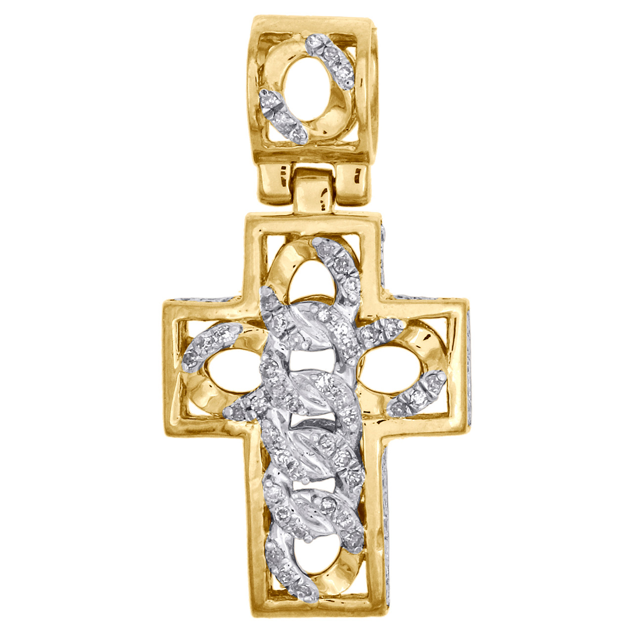 - 10K Yellow Gold Diamond 3D Cuban Link Design Cross Pendant Mini Charm 0.33 CT.