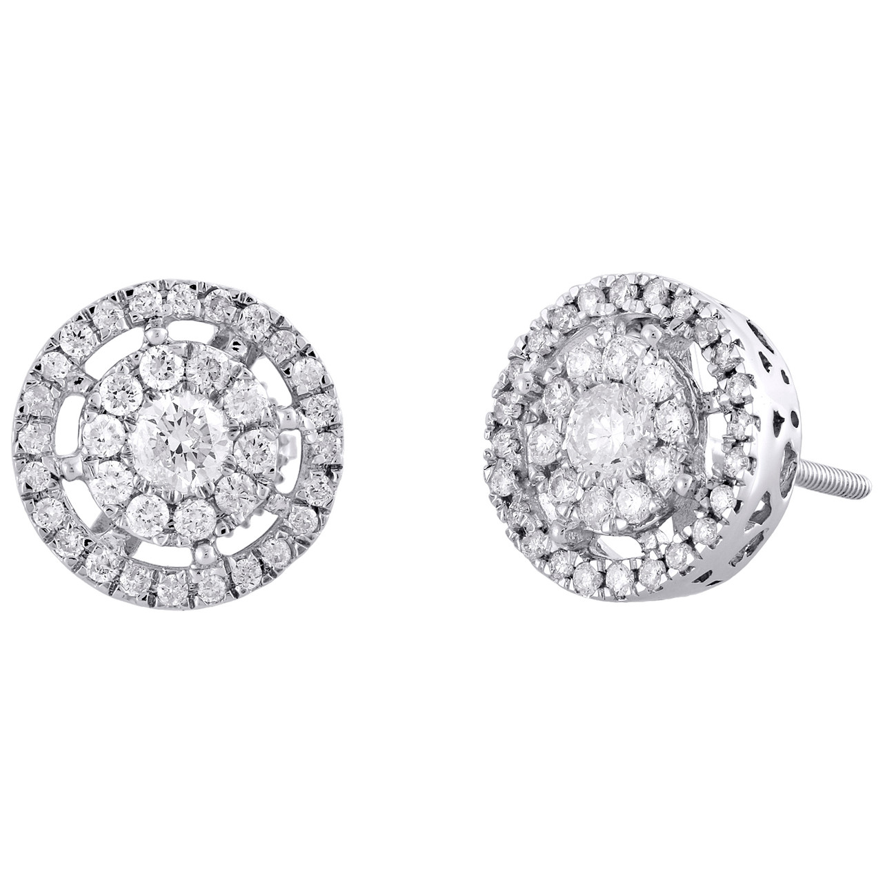 Stunning pair of studs added to our diamond earring collection. These earrings are expertly crafted in 14K white gold. Radiant with 0.75 ct. t.w. of genuine diamonds, these studs are high polished for a bright shine. These particular studs consist of round diamonds in shared prong setting, making the overall appearance larger and lustrous. Screw-backs for secure wear, these earrings will be a great addition to your jewelry collection. Round shape frame give these pair of earrings depth and makes a bold fashion statement. Perfect size, these studs are 10.75mm in width and 4.75mm thickness.