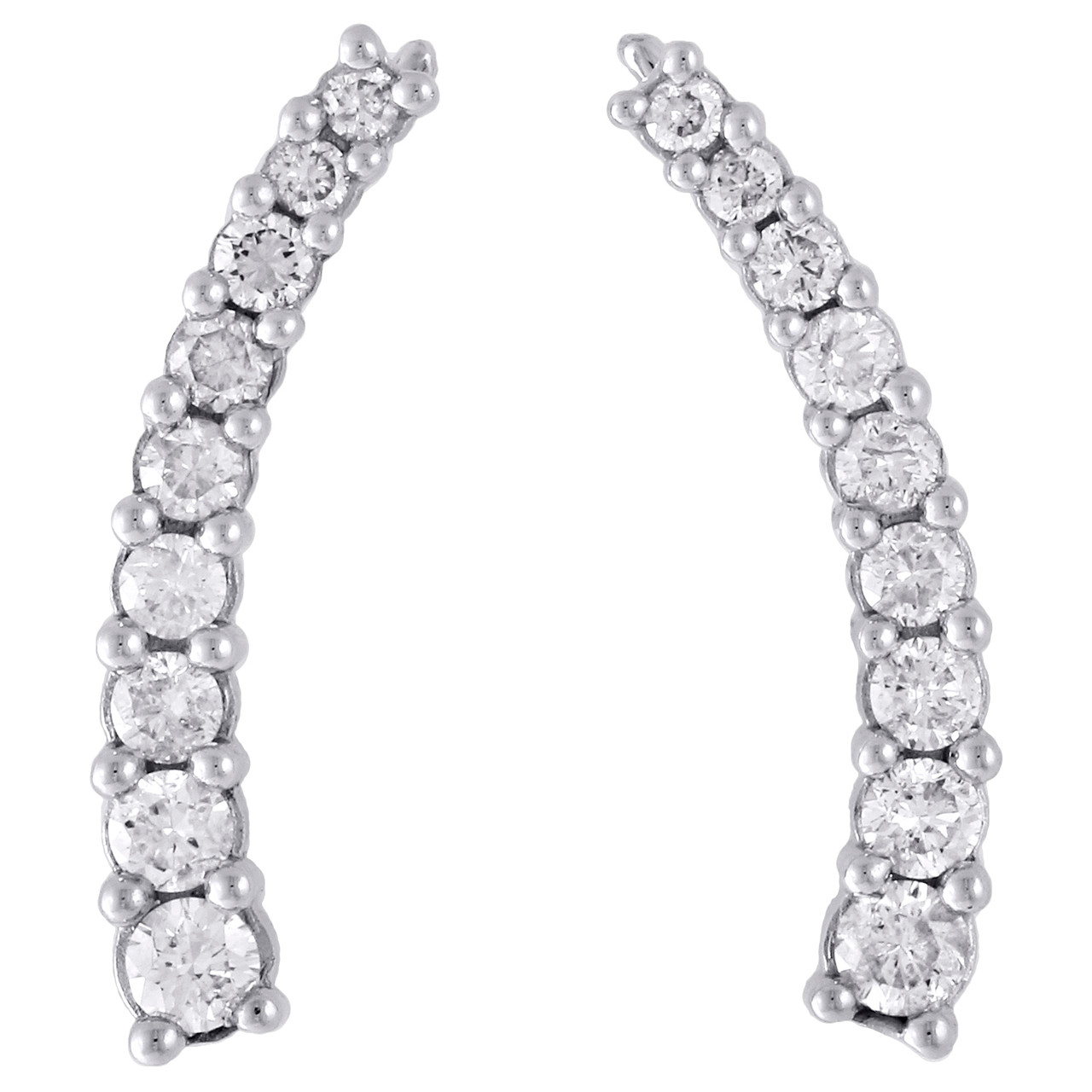Stunning pair of ear climbers added to our collection. These earrings are expertly crafted in 10K White Gold with a row of graduated white round cut diamonds. These earrings showcase graduated stone design. Radiant with 1 ct t.w. These particular studs consist of genuine round cut diamonds in a prong setting, making the overall appearance larger and lustrous. Hook for secure wear, these earrings will make a great gift for any occasion. Perfect size, these earrings are 0.95" long, 0.15" wide and 3.25mm thickness. One row graduated diamond prong setting frame give these earring depth and makes a bold fashion statement.