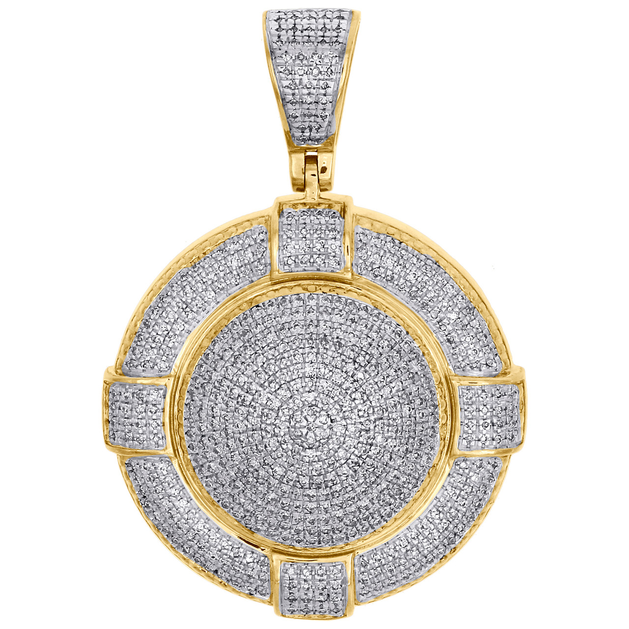 This eye-catching statement Domed Circle Medallion diamond pendant is crafted in solid 10K Yellow Gold and shimmering white diamonds, ensuring sparkle from every angle. Radiant with 7/8 ct. t.w. of genuine diamonds, this pendant is polished to a bright shine. Exclusive style has a well built frame to withstand everyday wear and tear. The diamonds are securely held between the gold mounting in a pave setting close together, making the overall appearance larger and lustrous. Diamond bail to match and give this exclusive pendant a custom look. These are all 100% genuine round diamonds. All the diamonds are of same clarity and color throughout. Great size pendant is 1.55 inches in length and weighs approx. 7.1 grams. This one of a kind piece would make a perfect addition to your jewelry collection.