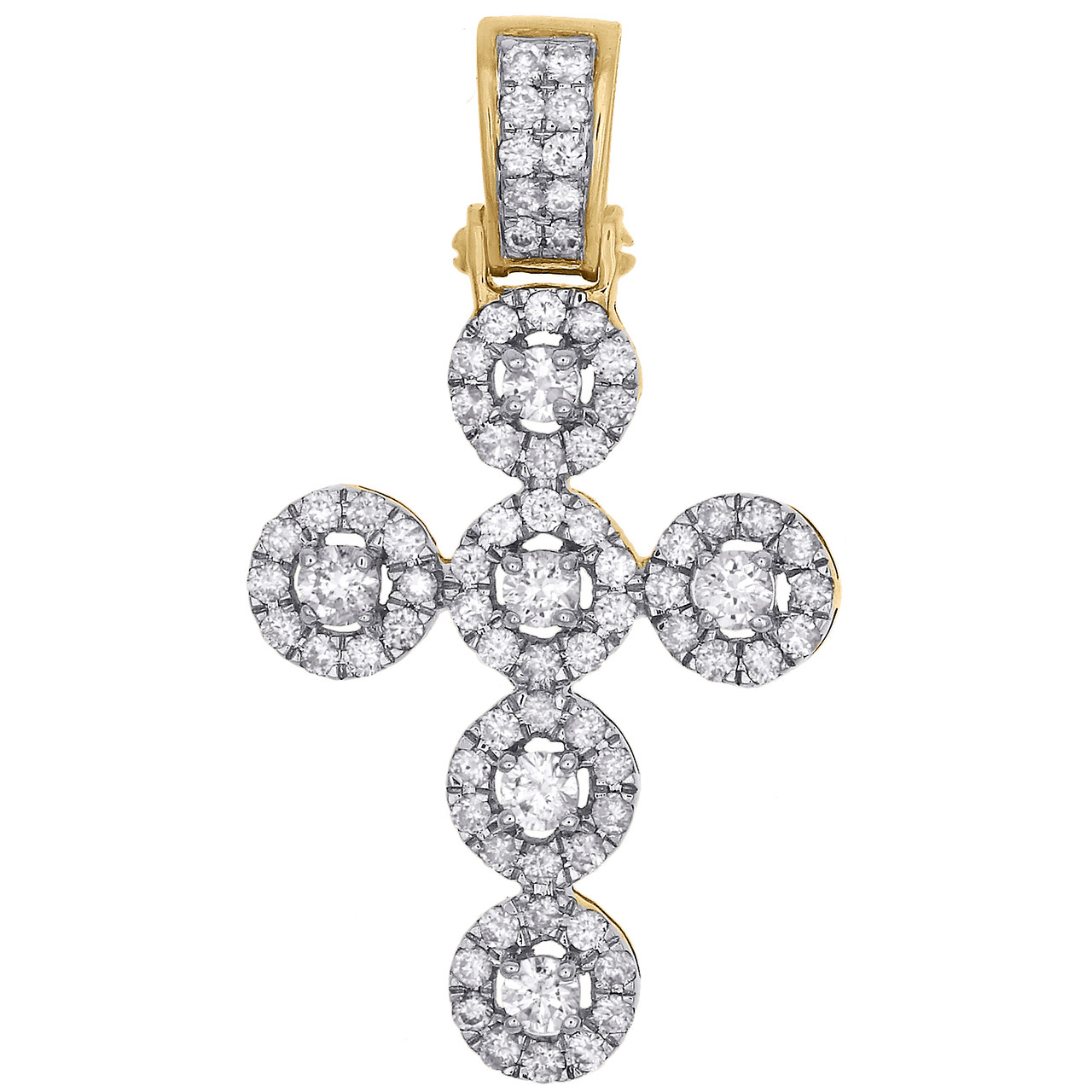 (2.7 gr. of 10K Yellow Gold | Total Carat Weight: 1.20 ct. t.w. of White Diamonds | Length: 1.40" (including bail) | Width: 0.75" | Clarity: I1 - I2 | Color: H - I | Unisex Genuine Round Cut Diamond Halo Cluster Cross Statement Pendant Charm)