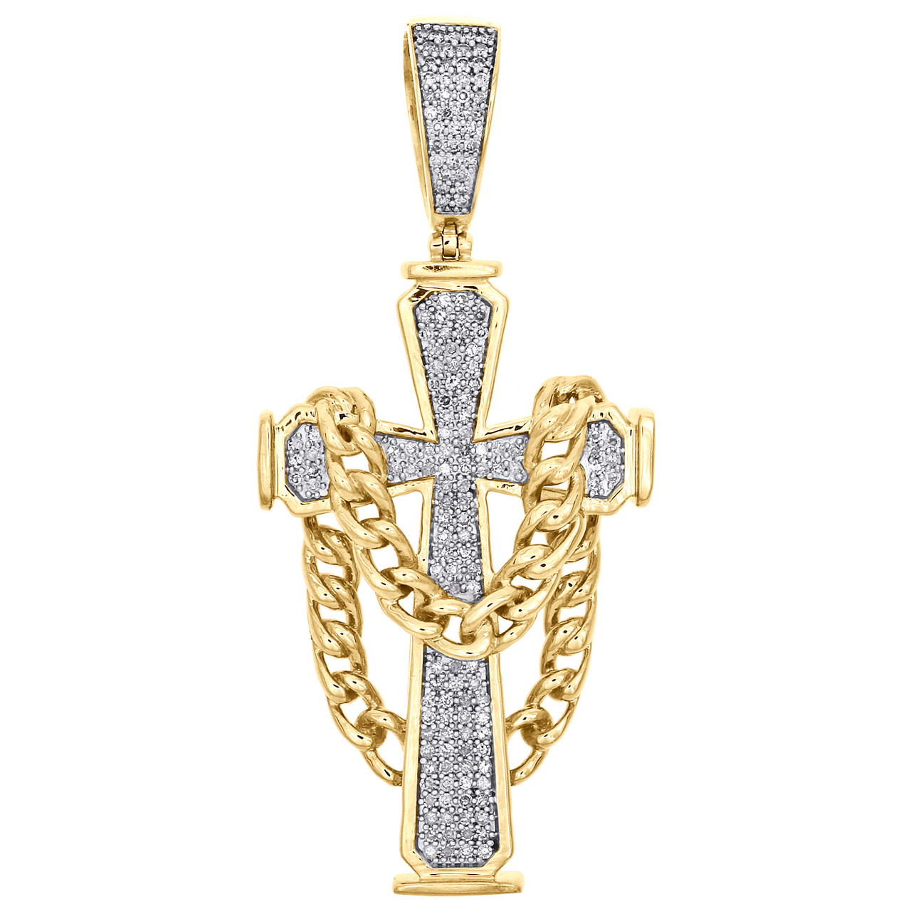 (8.50 gr. of 10K Yellow Gold | Total Carat Weight: 0.37 ct. t.w. of White Diamonds | Length: 2" (including bail) | Width: 0.90" | Thickness: 6mm | Clarity: I1 - I2 | Color: H - I | Men's Genuine Round Diamond Fancy Cuban Link Religious Cross Pendant Statement Pave Charm)