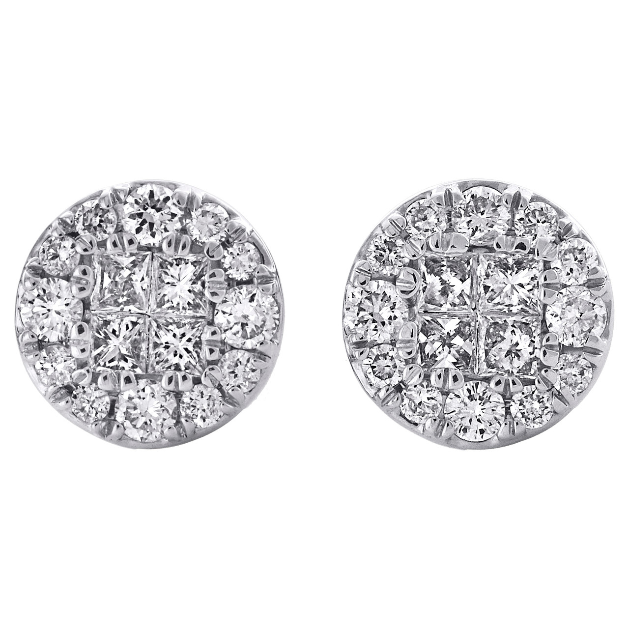 - 14K White Gold Princess Diamond Soleil Cluster Stud 9.75mm Circle Earrings 1 CT.