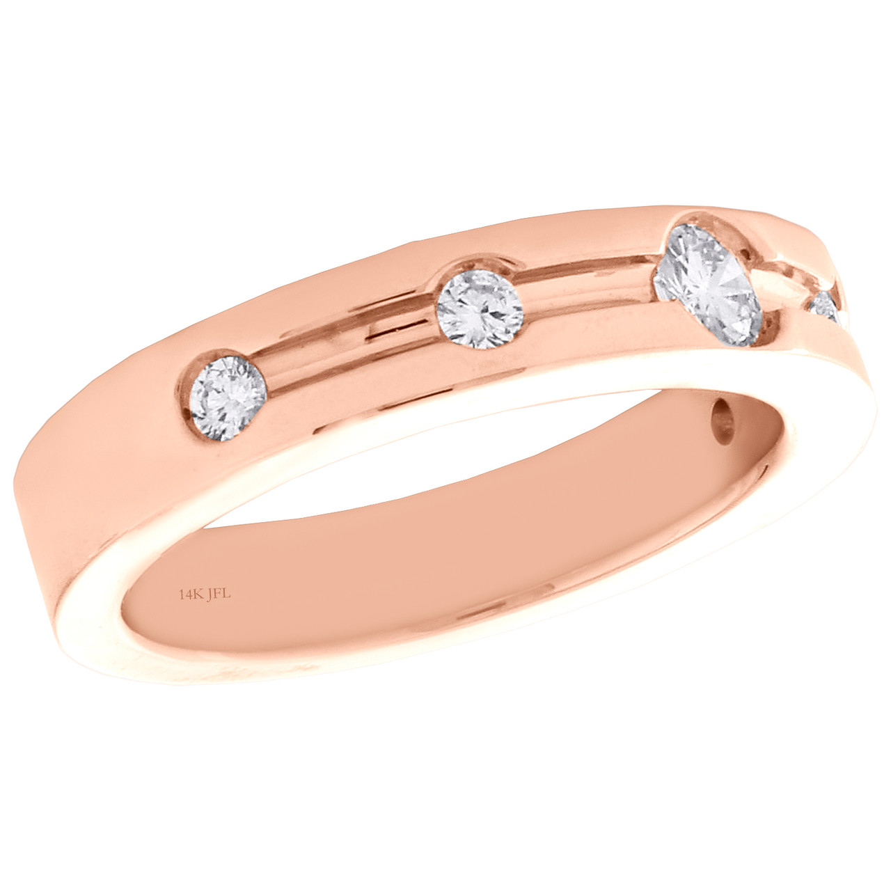 Brilliantly crafted in solid 14K Rose Gold. This ring features sparkling round diamonds set in 4mm frame. This design was intricately thought out so it can be worn for any occasion, no matter how casual or fancy. One row of round diamonds are the focal point of this wedding band which makes a bold fashion statement. Make an impression with this classic ring captivating 1/4 ct. t.w of full cut round white diamonds, with high polished to a brilliant shine. This ring is solid back and weighs approx. 6.6 grams. All diamonds are 100% natural and are matching throughout. The diamonds are securely held in bezel setting, making the overall appearance larger and lustrous. Available in size 7. For special sizing request please send us a message, charges apply.