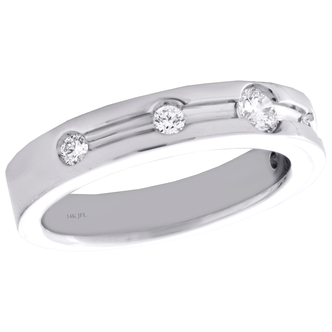 Brilliantly crafted in solid 14K White Gold. This ring features sparkling round diamonds set in 4mm frame. This design was intricately thought out so it can be worn for any occasion, no matter how casual or fancy. One row of round diamonds are the focal point of this wedding band which makes a bold fashion statement. Make an impression with this classic ring captivating 1/4 ct. t.w of full cut round white diamonds, with high polished to a brilliant shine. This ring is solid back and weighs approx. 6.4 grams. All diamonds are 100% natural and are matching throughout. The diamonds are securely held in bezel setting, making the overall appearance larger and lustrous. Available in size 7. For special sizing request please send us a message, charges apply.