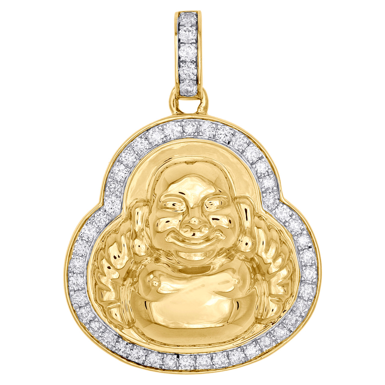 (9.6 gr. of 10K Yellow Gold | Total Carat Weight: 1.25 ct. t.w. of White Diamonds | Length: 1.65" (including bail) | Width: 1.20" | Clarity: SI2 - I1 | Color: H - I | Mens Genuine Round Diamond Laughing Buddha 3D Pendant Statement Pave Charm)