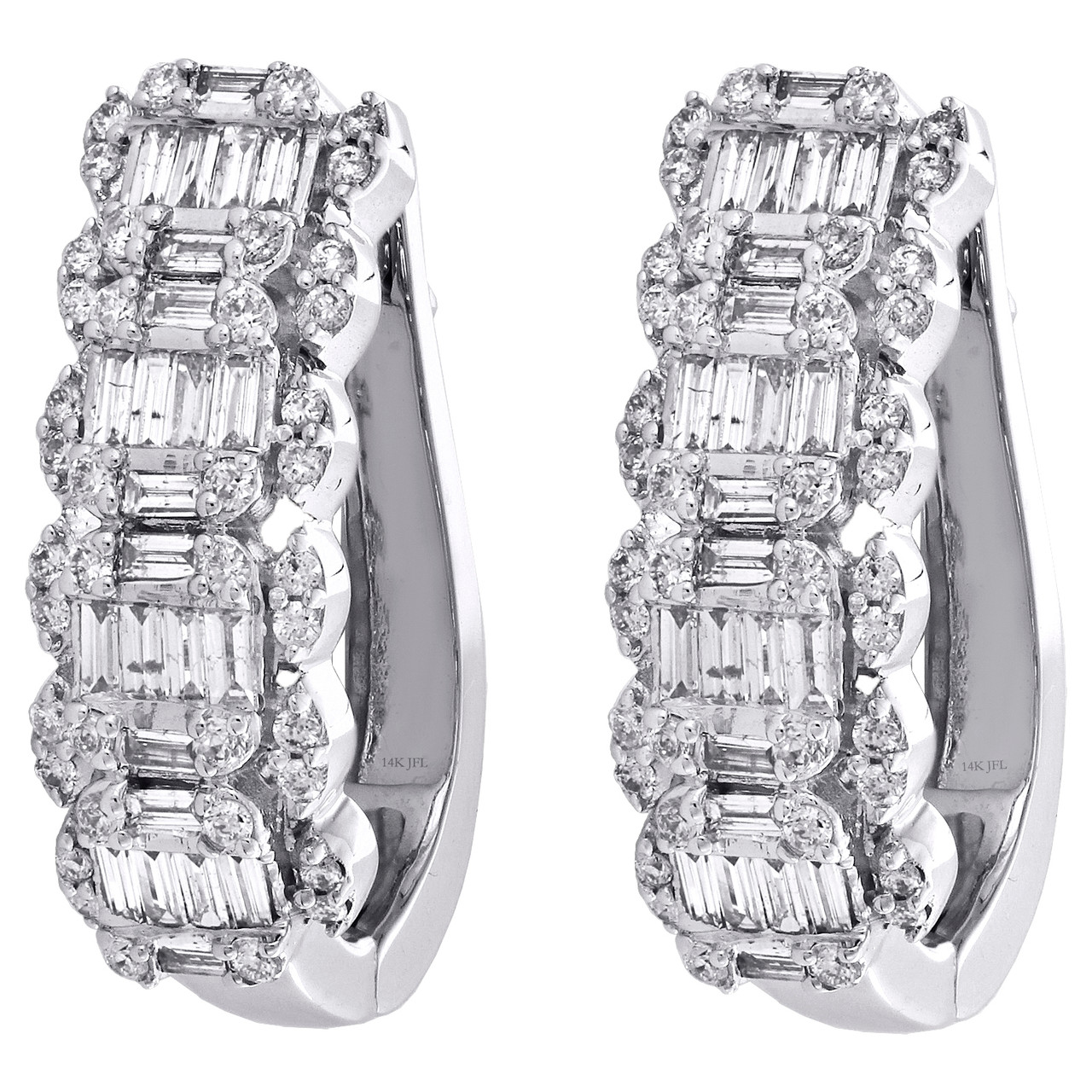 (7.5 gr. of 14K White Gold | Total Carat Weight: 1.20 ct. t.w. of White Diamonds | Long: 0.80" | Width: 7.35mm | Thickness: 4mm | Clarity: SI2 - I1 | Color: H - I | Women's Genuine Round & Baguette Diamond Hoop / Huggie Earrings)