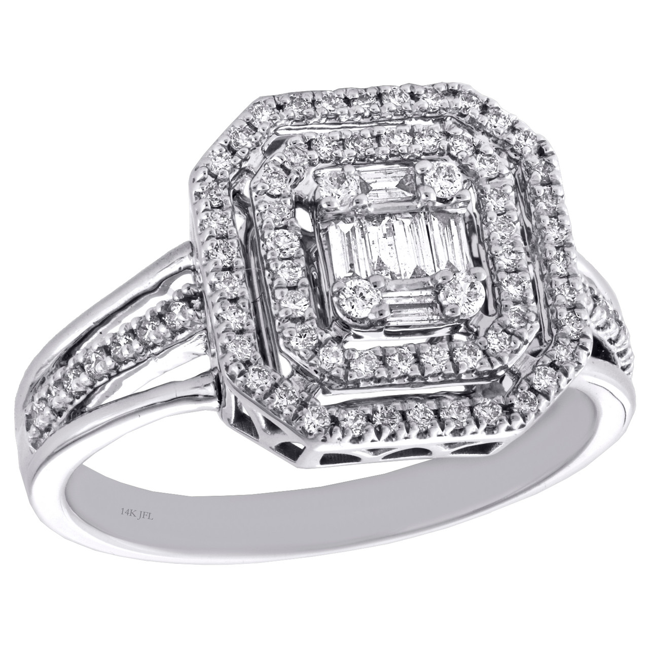14K White Gold Round & Baguette Diamond Octagon Double Halo Cocktail Ring 1/2 CT