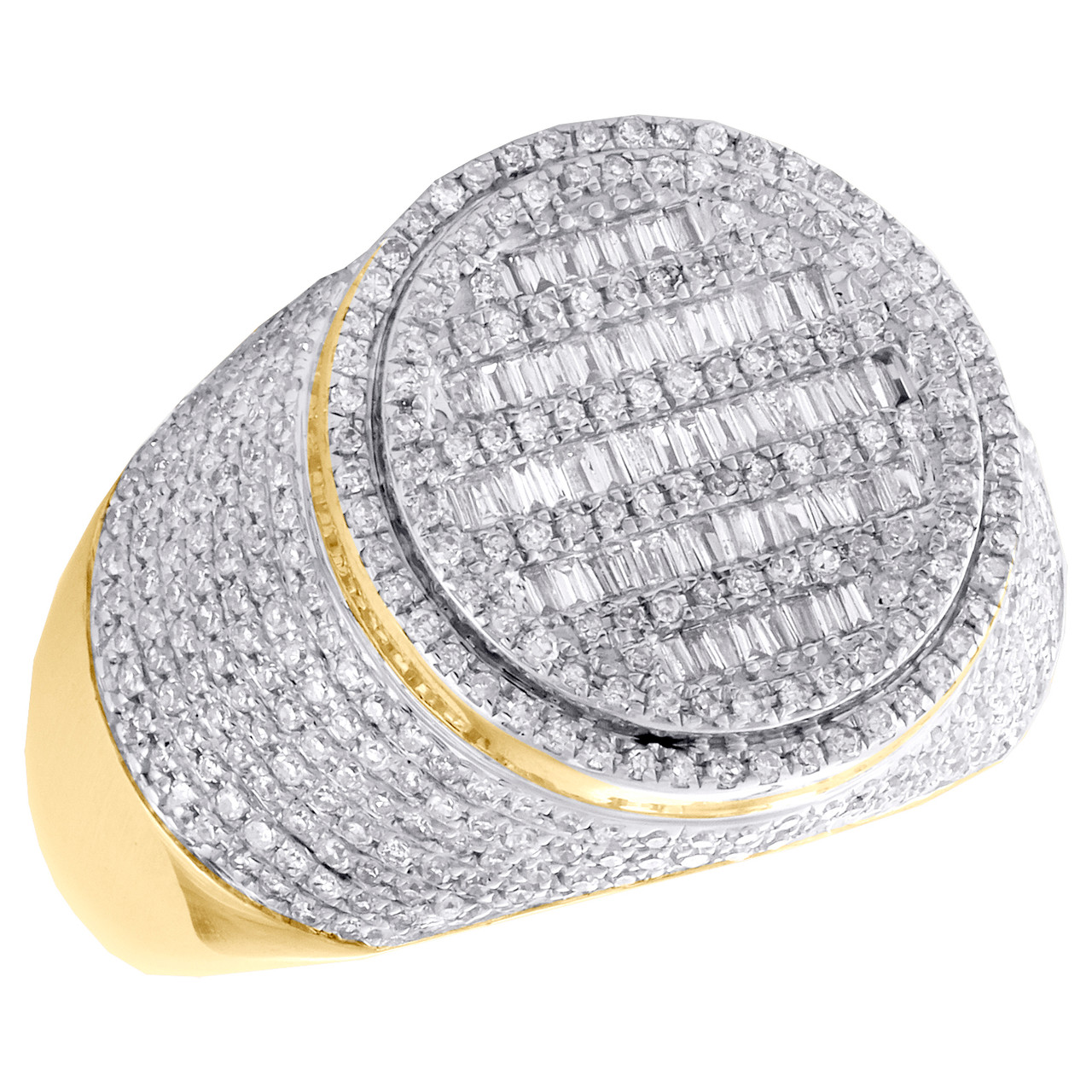 (10.3 gr. of 10K Yellow Gold | Total Carat Weight: 1.75 ct. t.w. of White Diamonds | Width: 18mm | Clarity: SI2 - I1 | Color: H - I | Men's Natural Round and Tapered Baguette Cut Diamond Raised Tier Circle Frame Statement Pinky Ring Pave Band)