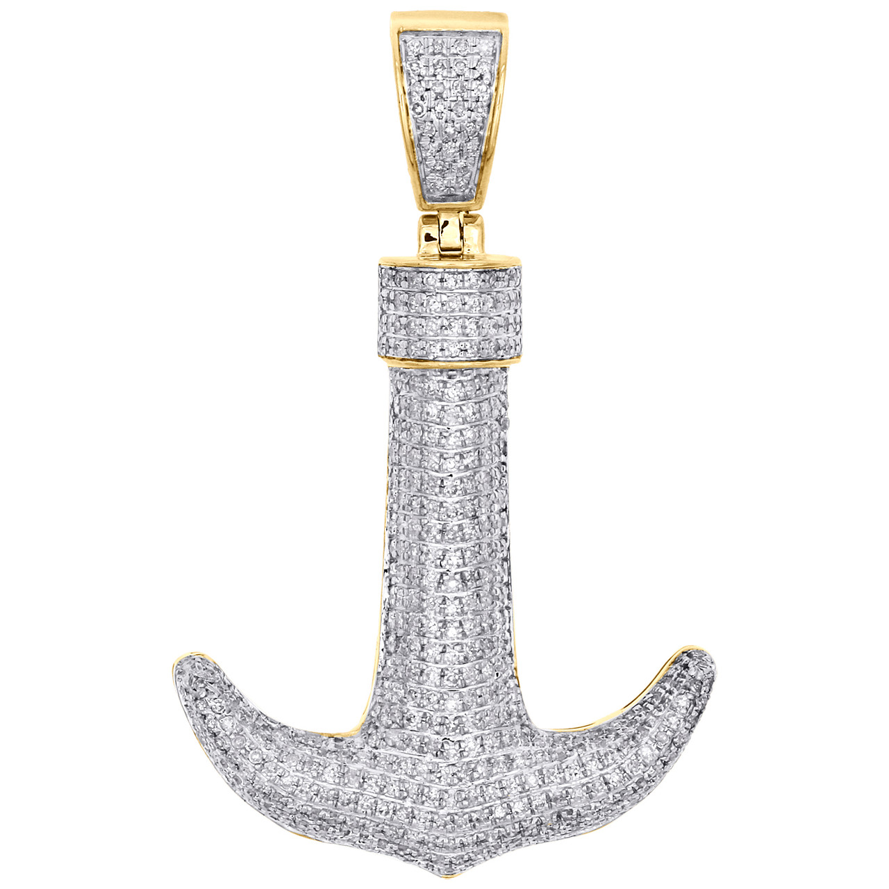 (6.40 gr. of 10K Yellow Gold | Total Carat Weight: 1.25 ct. t.w. of White Diamonds | Length: 1.85" (including bail) | Width: 1.15" | Clarity: I1 - I2 | Color: H - I | Men's Genuine Round Diamond Sailor Ship Anchor Pendant Statement Pave Charm)
