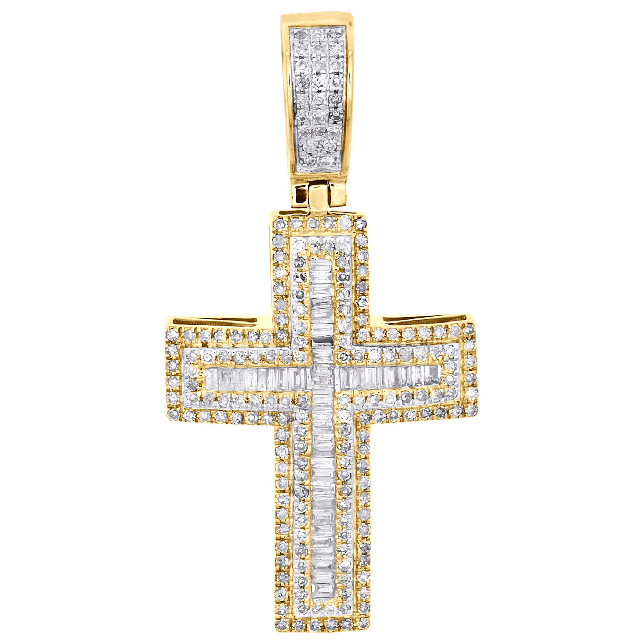 (5.40 gr. of 10K Yellow Gold | Total Carat Weight: 0.87 ct. t.w. of White Diamonds | Length: 1.55" (including bail) | Width: 0.80" | Clarity: SI2 - I1 | Color: G - H | Men's Genuine Round and Baguette Cut Diamond Domed Cross Pendant Statement Charm)