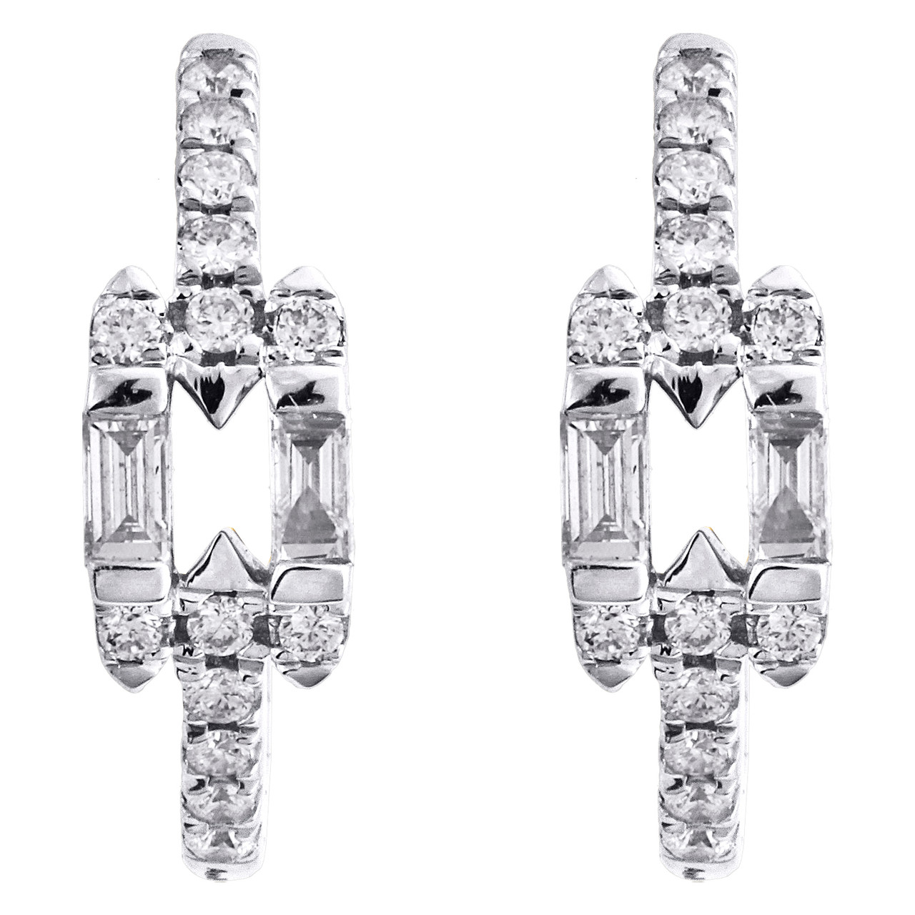 - 14K Yellow Gold Round & Baguette Diamond Hoop 0.55" Statement Earrings 1/3 CT.