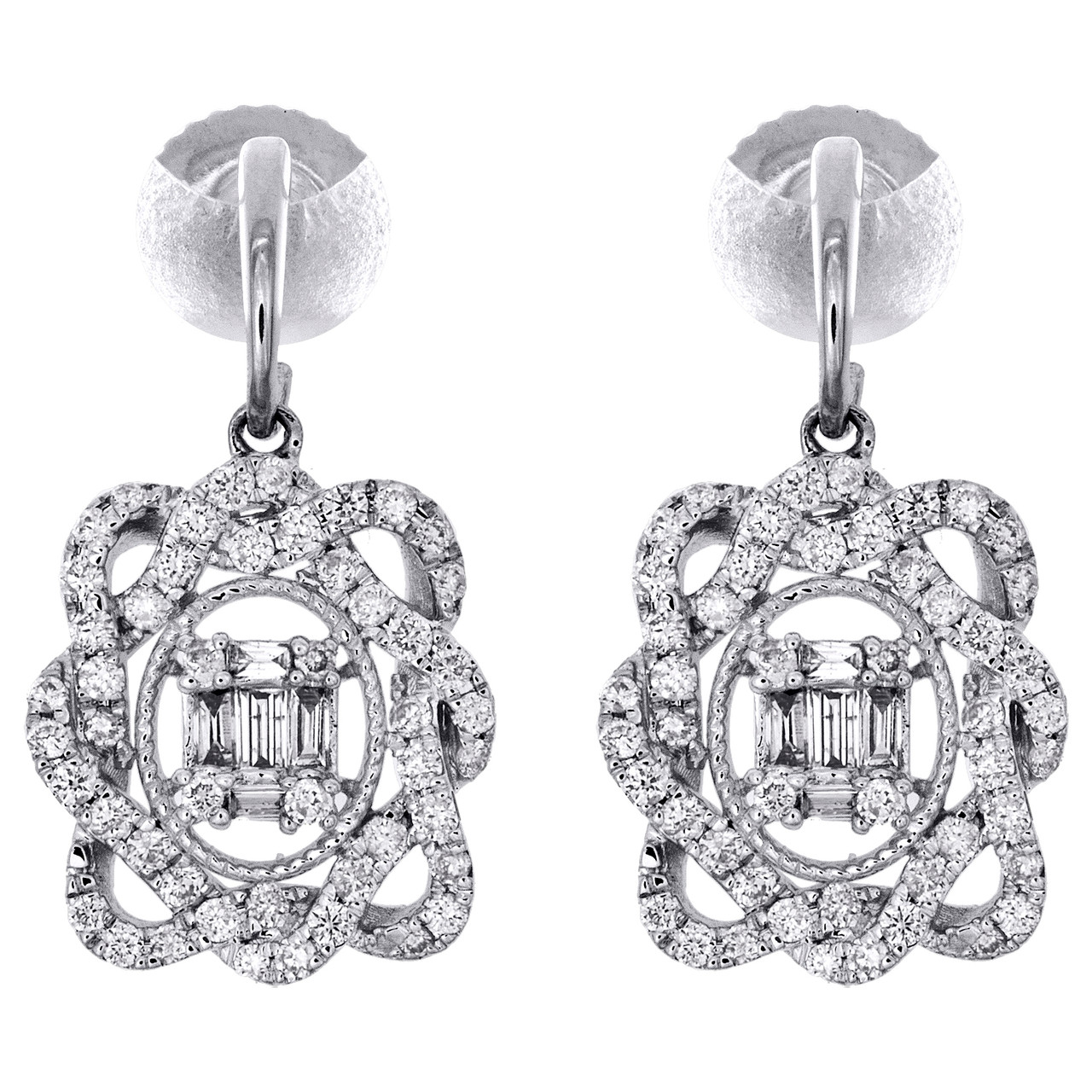 - 14K White Gold Round & Baguette Diamond Fancy Dangle Drop 0.75" Earrings 1/2 CT.