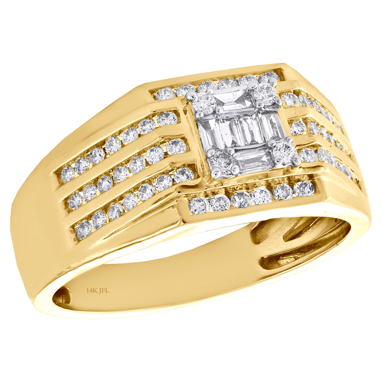 (6.8 gr. of 14K Yellow Gold | Total Carat Weight: 0.75 ct. t.w. of White Diamonds | Width: 10.25mm | Clarity: SI2 - I1 | Color: H - I | Men's Round & Baguette Cut Genuine Diamond Invisible Set Cluster Center Wedding Band Statement Pinky Ring )