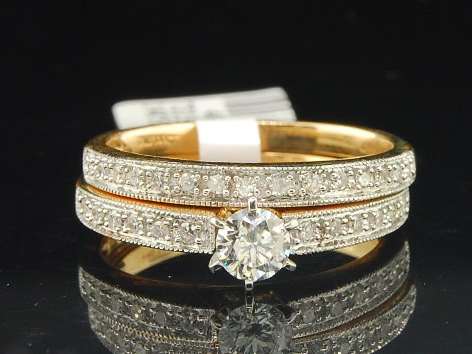 Up for auction is a very affordable priced diamond bridal set. This ring is set in real 14K Yellow Gold and real round diamonds in prong setting. Diamonds are set close together for a uniform and clean look. The diamonds are machine set precisely to give it a clean finish.