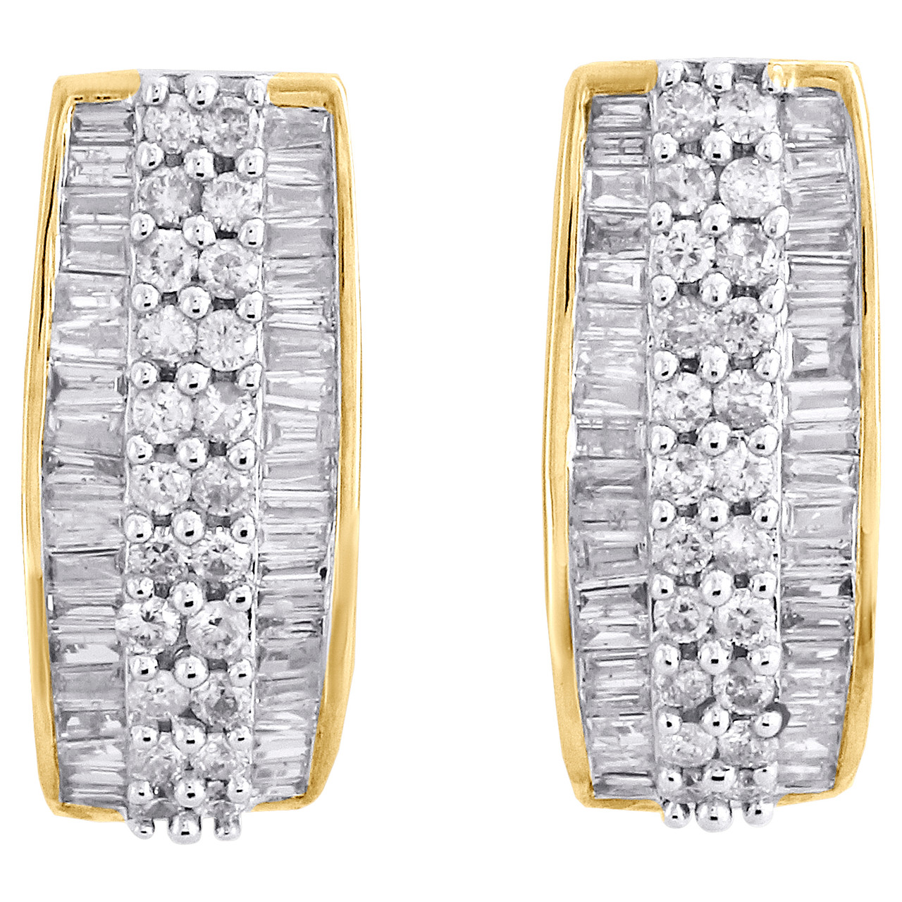 Color, sparkle and style combine to form these amazing diamond hoop / huggie earrings. Crafted in precious 14K yellow gold, these huggie earrings feature 2 rows of round diamonds in the center and a row of baguette diamonds on each side. Perfect for any-time wear, these earrings captivate with 0.88 ct. t.w. of genuine diamonds. Polished to a bright shine, all round cut diamonds are invisible and shared prong setting, making the overall appearance larger and lustrous. These earrings secure comfortably with omega closure backing for secure wear. These diamond huggies are an elegant choice anytime and will make a great addition to your jewelry collection with this classic piece.