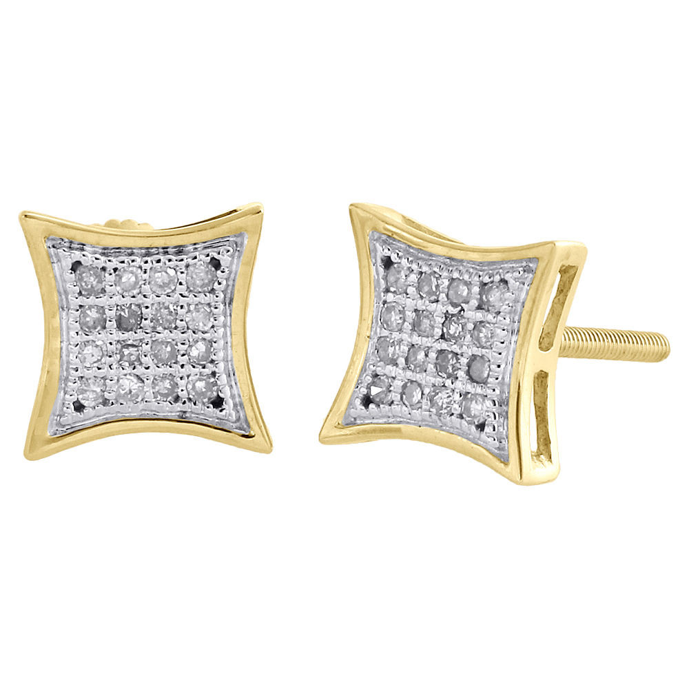 Stunning pair of studs added to our Rodeo Jewelers collection. These earrings are expertly crafted in 10k yellow gold and showcases real round diamonds in a kite shape. Radiant with 0.10 ct. total weight of diamonds. These particular studs consist of genuine round cut diamonds in a shared prong setting and buffed to a brilliant bright shine. Screw-backs for secure wear, these earrings will make a great gift for any occasion. Perfect size for men's, these studs are 7.10mm in width & 2.60mm thickness. Square frame give these earring depth and makes a bold fashion statement. Great gift for any occasion.