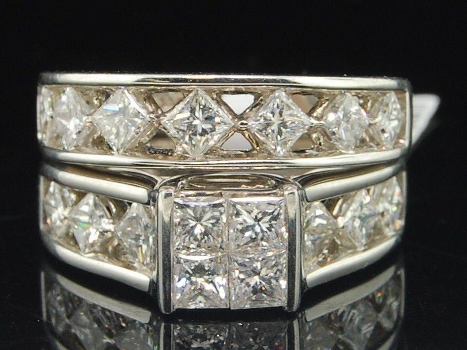 Up for auction is a very affordable priced diamond bridal set. This ring is set in real 14K White Gold and real princess cut diamonds in prong & invisible setting. Diamonds are set close together for a uniform and clean look. The diamonds are machine set precisely to give it a clean finish.