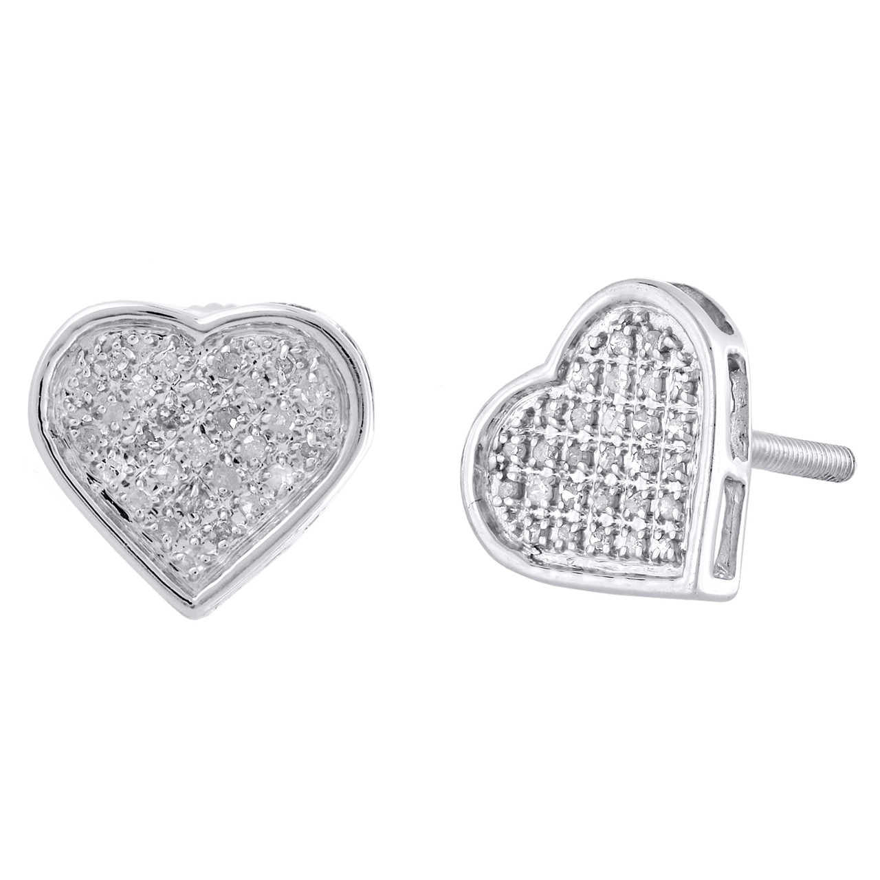 925 Sterling Silver Round Diamond Ladies Heart Studs 9.75mm Pave Earrings 1/6 CT