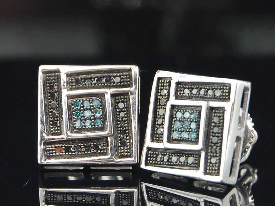 - Blue & Black Diamond Square Studs Mens White Gold Designer Earrings 0.35 Tcw.