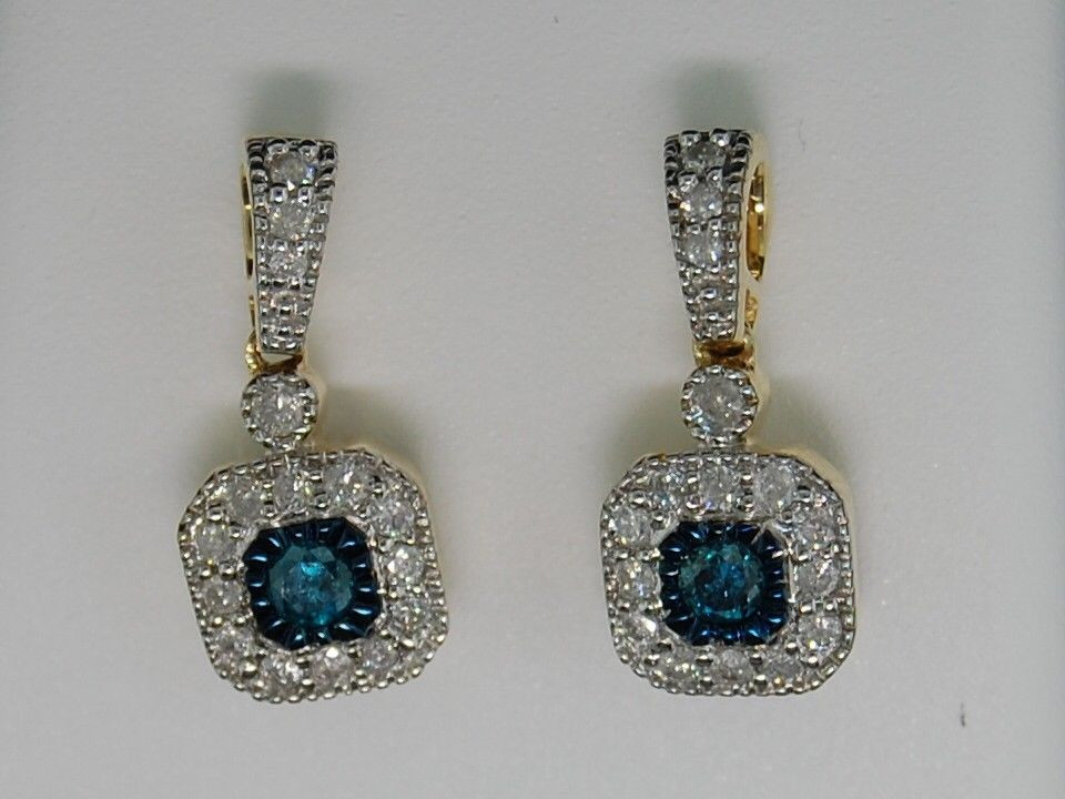 - 10K LADIES YELLOW GOLD .66 CT BLUE SOLITAIRE WHITE DIAMOND DANGLE EARRINGS HOOPS