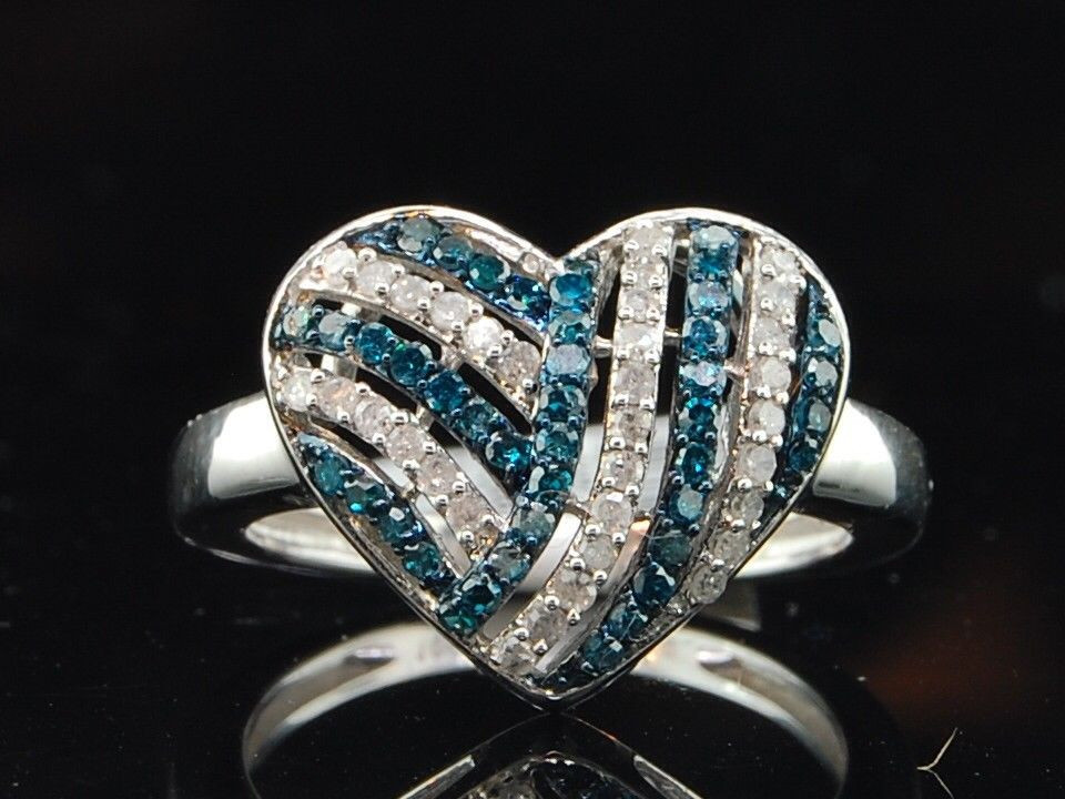 - Blue Diamond Heart Ring 10K White Gold Round Fashion Love Cocktail Band 1/2 Ct.