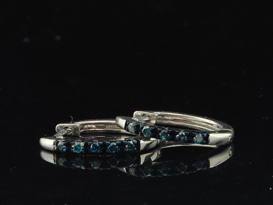 - Blue Diamond Huggie Earrings Ladies .925 Sterling Silver Round Hoops 1/10 Tcw.
