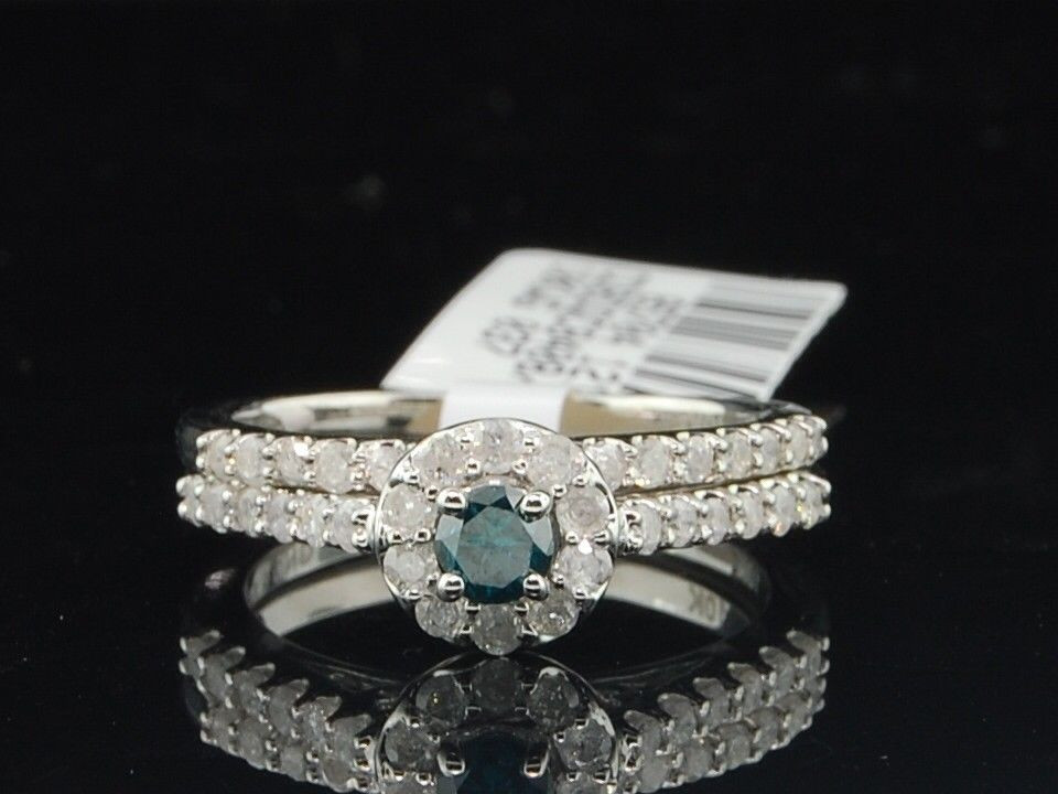 - Ladies 10K White Gold Blue Diamond Flower Engagement Ring Bridal Set 0.85 Ct.