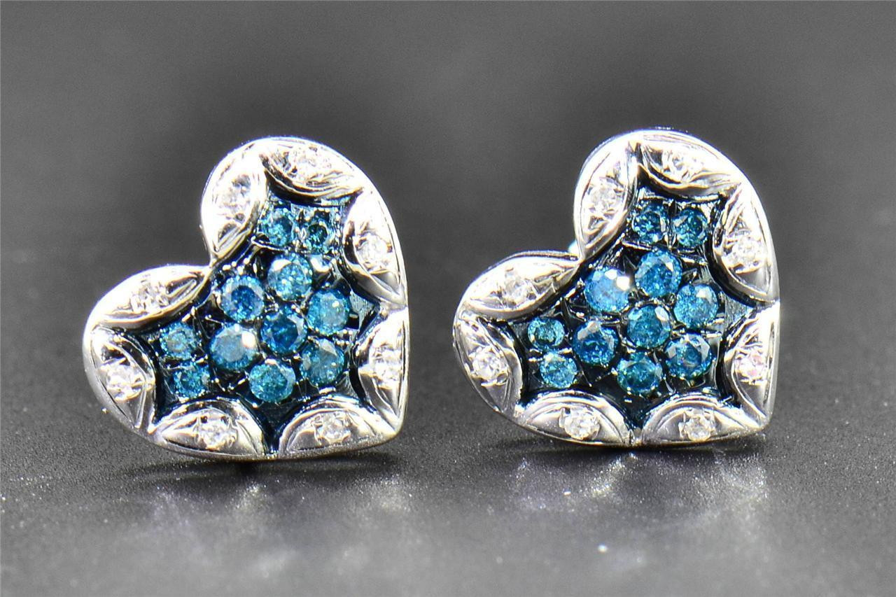 - 0.25 CT Blue Diamond Studs Heart Love Shape 10K White Gold Designer Earrings