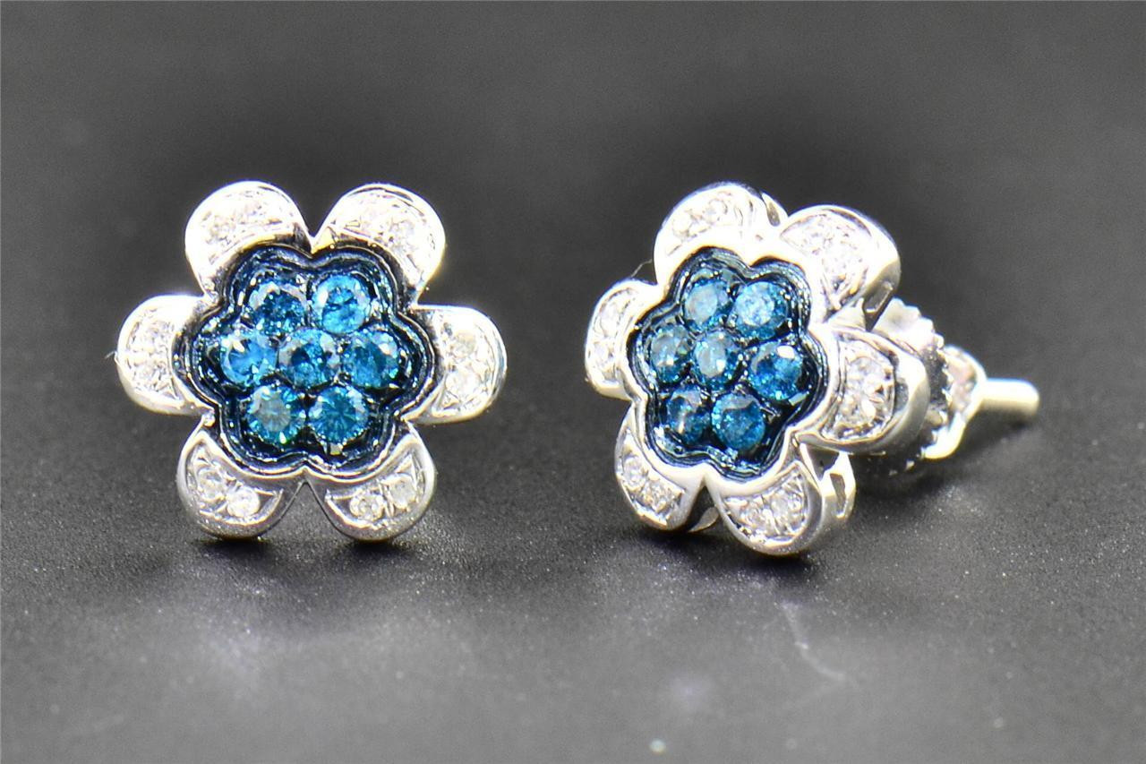 0.22 CT Blue & White Diamond Studs 10K White Gold Flower Shape Pave Earrings