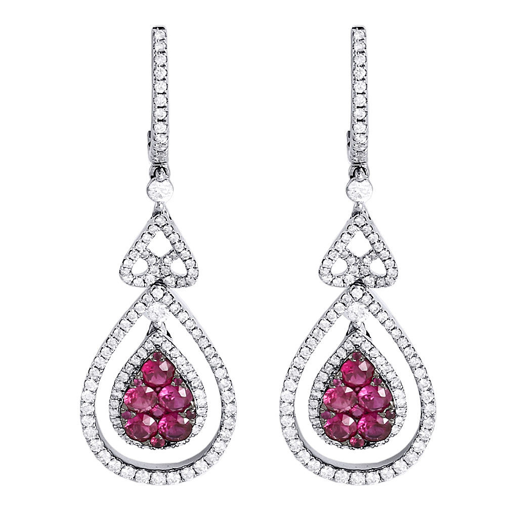- Red Ruby & Diamond Dangle Earrings 14K White Gold Teardrop Design 2.62 Tcw.
