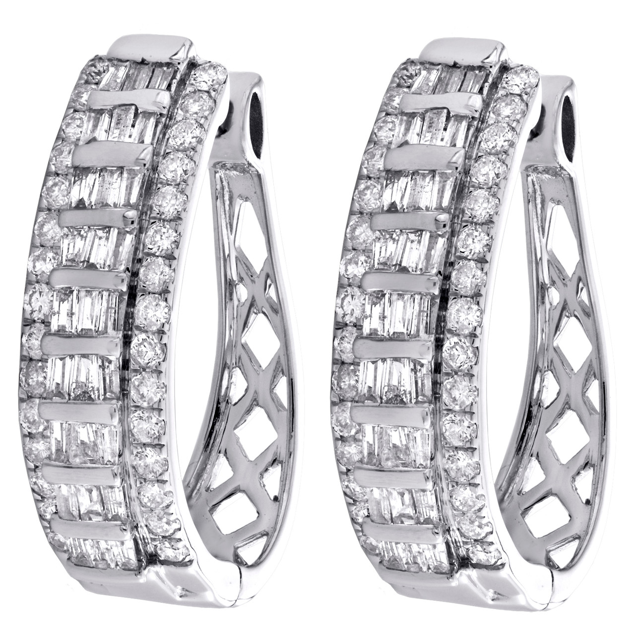 (5.5 gr. of 10K White Gold | Total Carat Weigth: 1.50 ct. t.w. of White Diamonds | Long: 0.85" | Width: 0.70" | Thickness: 6.50mm | Clarity: SI2 - I1 | Color: H - I | Women's Genuine Round and Baguette Diamond Hoop / Huggie Earrings)