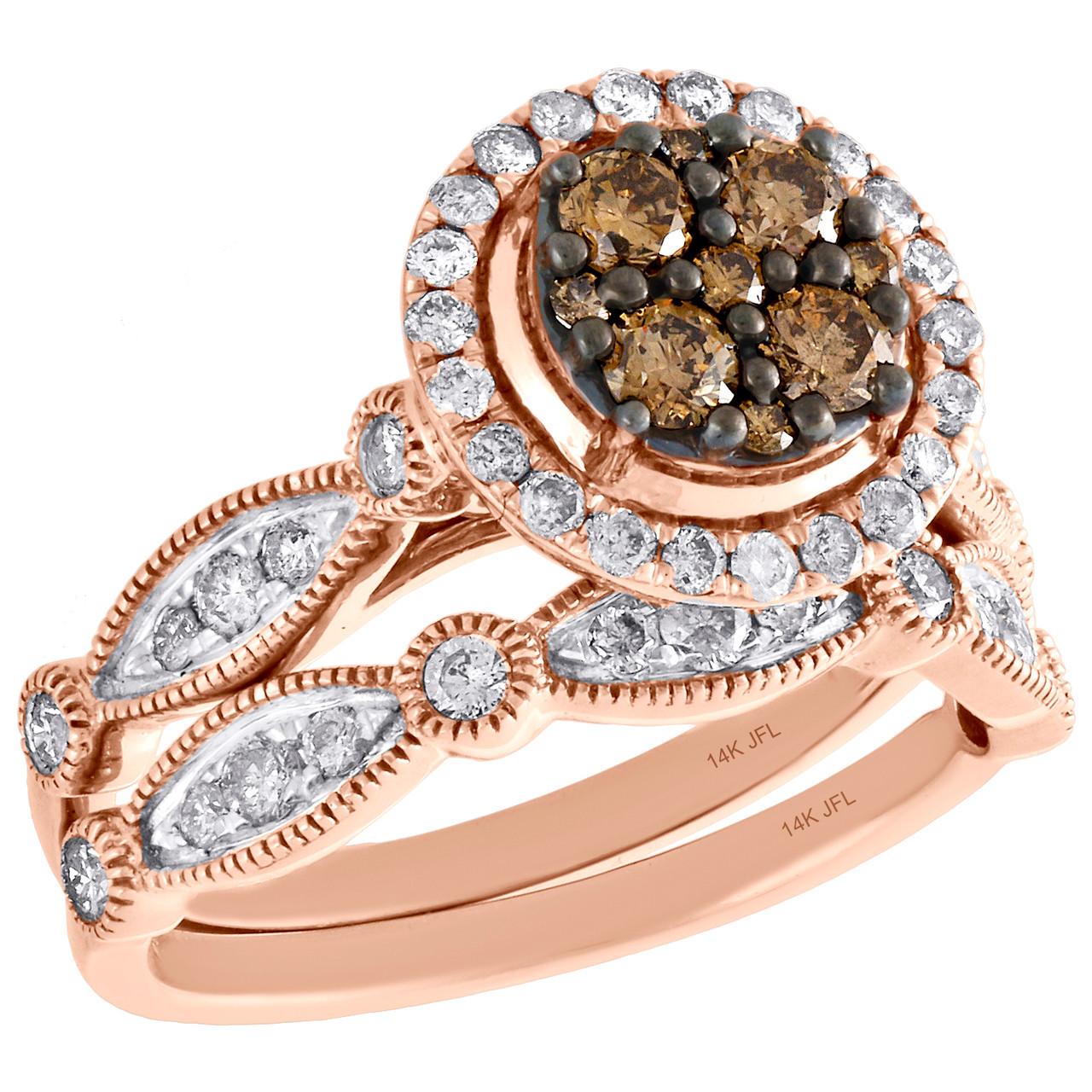 - 14K Rose Gold Brown Diamond Bridal Set Flower Engagement + Wedding Rings 1 Ct.